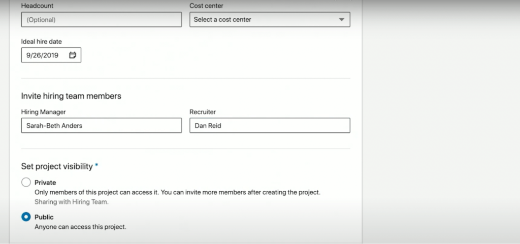 Aby rozpocząć, utwórz nowy projekt tak, jak w przypadku rekrutacji LinkedIn. Istnieje kilka dodatkowych pól do wypełnienia, w tym etapy zatrudniania menedżera i rurociągu (ekran, rozmowa kwalifikacyjna, oferta itp.)