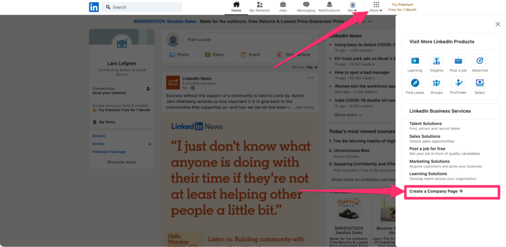 Zacznij od kliknięcia na Praca ikona w górnej nawigacji, a następnie Twórz stronę firmy.
