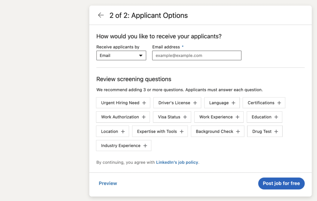 Następnie przechodzisz przez opcje, aby wypełnić opis stanowiska, dodać umiejętności, aby Twoja praca była bardziej widoczna dla właściwych kandydatów, wybrać sposób przyjmowania kandydatów (za pośrednictwem poczty e-mail lub zewnętrznej strony internetowej) i dodać wymagania dotyczące badań przesiewowych.