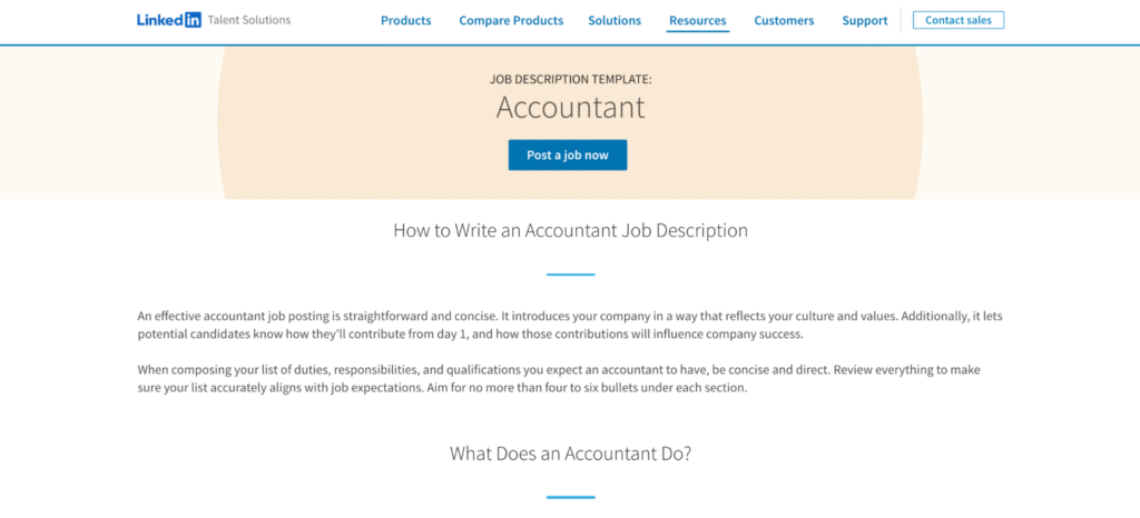 Opis stanowiska zoptymalizowanego pod kątem LinkedIn: Ponownie, konkurencja jest wysoka, więc niech to się liczy. LinkedIn oferuje pomocne wskazówki i szablony opisów stanowisk dla każdego stanowiska, o którym możesz pomyśleć (znajdziesz je na business.linkedin.com, w tym wiele innych przydatnych zasobów rekrutacyjnych).