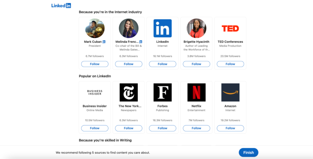 Na koniec LinkedIn przeprowadzi Cię przez opcje dodawania zdjęcia profilowego, pobierania aplikacji mobilnej i śledzenia firm, które są dla ciebie odpowiednie.