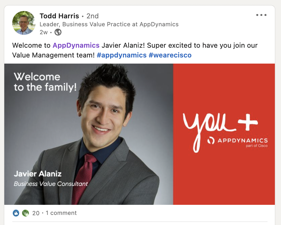 Szablony dla nowych pracowników: Po zatrudnieniu będziesz chciał udostępnić wiadomości na LinkedIn, aby podnieść świadomość i pomóc uczłowieczyć swoją markę. Zwłaszcza jeśli twoi menedżerowie ds. rekrutacji nie są ekspertami w mediach społecznościowych, mają gotowe szablony lub przykłady. Oto dobry przykład, który widziałem w moim kanale: