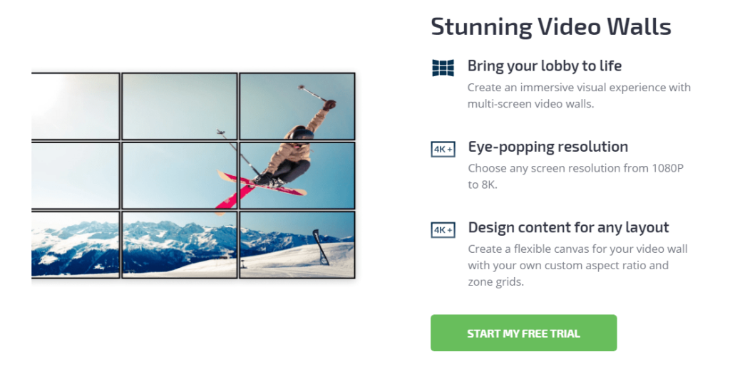 Masz lobby, które bardzo potrzebuje ściany wideo? TelemetryTV pomaga uczynić to rzeczywistością dzięki oszałamiającej funkcji ściany wideo. Dzięki niemu możesz stworzyć wrażenia wizualne, które wyróżnią Cię przyciągającymi wzrok obrazami, filmami lub kanałami społecznościowymi do wyboru.