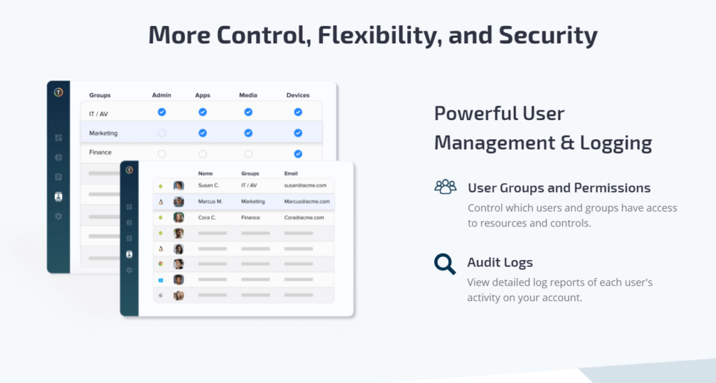 TelemetryTV pozwala ustawić określone uprawnienia użytkowników dla określonych grup użytkowników. W ten sposób zawsze wiesz, kto może przeglądać dane, a kto może edytować lub dodawać dowolną zawartość. Nie tylko to, ale TelemetryTV daje również dostęp do raportów logowania. Rejestruje i śledzi aktywność każdego użytkownika na twoim koncie.
