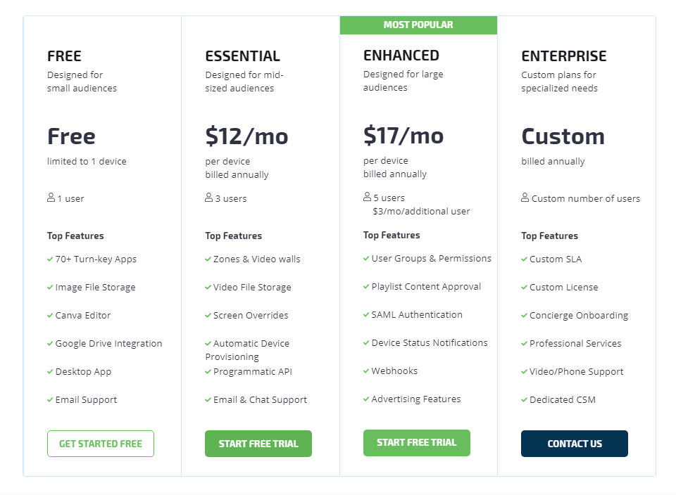 Jeśli jesteś małą firmą, która może ujść ci na sucho, używając tylko jednego ekranu do wyświetlania treści, zdecydowanie będziesz chciał skorzystać z darmowej warstwy TelemetryTV. Uzyskasz dostęp do przechowywania plików obrazów, edytora Canva, ponad integracji aplikacji 70, a nawet wsparcia e-mail, jeśli chcesz porozmawiać z zespołem obsługi klienta.