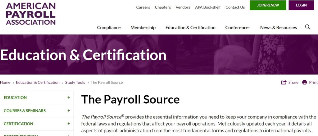 Payroll Source® to zespół wiedzy apa na temat płac. Ta książka obejmuje wszystkie aspekty administracji płacowej, począwszy od podstaw do najbardziej złożonych pojęć, takich jak Międzynarodowe listy płac i opodatkowania świadczeń i sprawozdawczości. Payroll Source jest również zatwierdzonym narzędziem do badania egzaminu CPP.