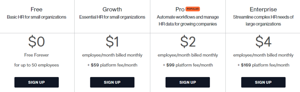 Ceny Freshteam zaczynają się od $ 59 miesięcznie plus $1 na pracownika. Bezpłatny plan forever oferuje również podstawowe funkcje HR, takie jak tablice kanban do śledzenia kandydatów, wykresy organizacji, polecenia pracowników, Katalog pracowników i współpraca zespołowa. Bezpłatny plan obsługuje do 50 pracowników. Freshteam oferuje również 21-dniowy bezpłatny okres próbny wszystkich swoich planów.