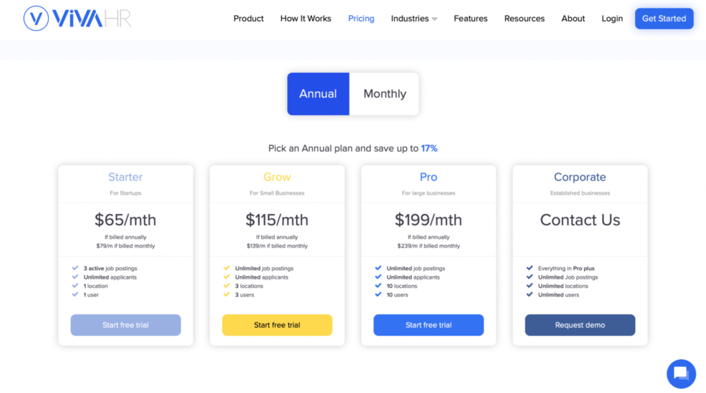 Plan Grow: $115 miesięcznie, rozliczane w $1,380 rocznie. Plan rozwoju jest najlepszy dla małych firm, które potrzebują do trzech użytkowników na platformie rekrutacyjnej. VIVAHR daje Ci trzech użytkowników, trzy lokalizacje i nieograniczoną liczbę ofert pracy i kandydatów.